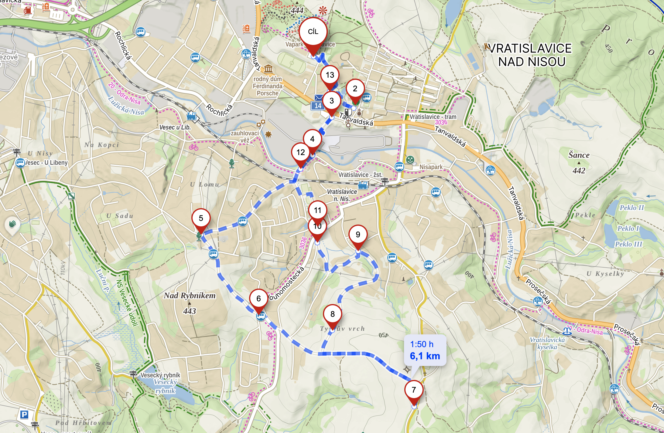 Pro druhý vratislavický okruh volím parkování přímo u Zámeckého parku. Hřiště zmíněná u předchozího okruhu tu máte prakticky pod nosem, stejně jako kavárnu Bez konceptu 101010. Pointa tohohle okruhu je ale trochu jiná: trasa vedoucí vilovou zástavbou směrem k liberecké čtvrti Vesec, s příslibem pěkného výhledu na celé město. A taky dvě další luxusní dětská hřiště vhodná i pro menší dětičky.