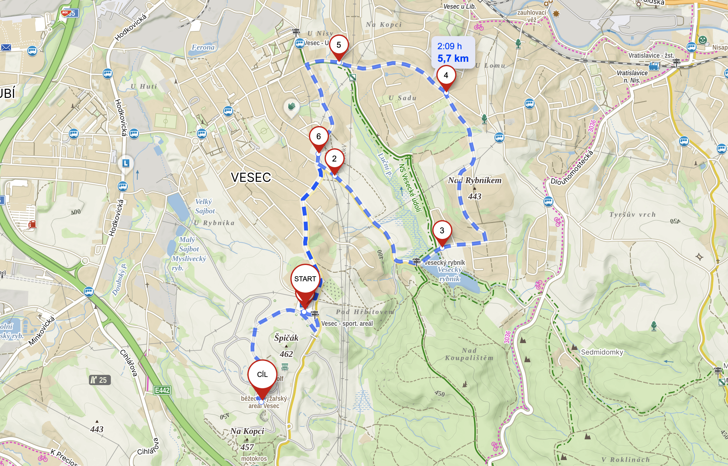 Okruh ve Vesci: k rybníku, mezi vilami a běžeckým areálem
